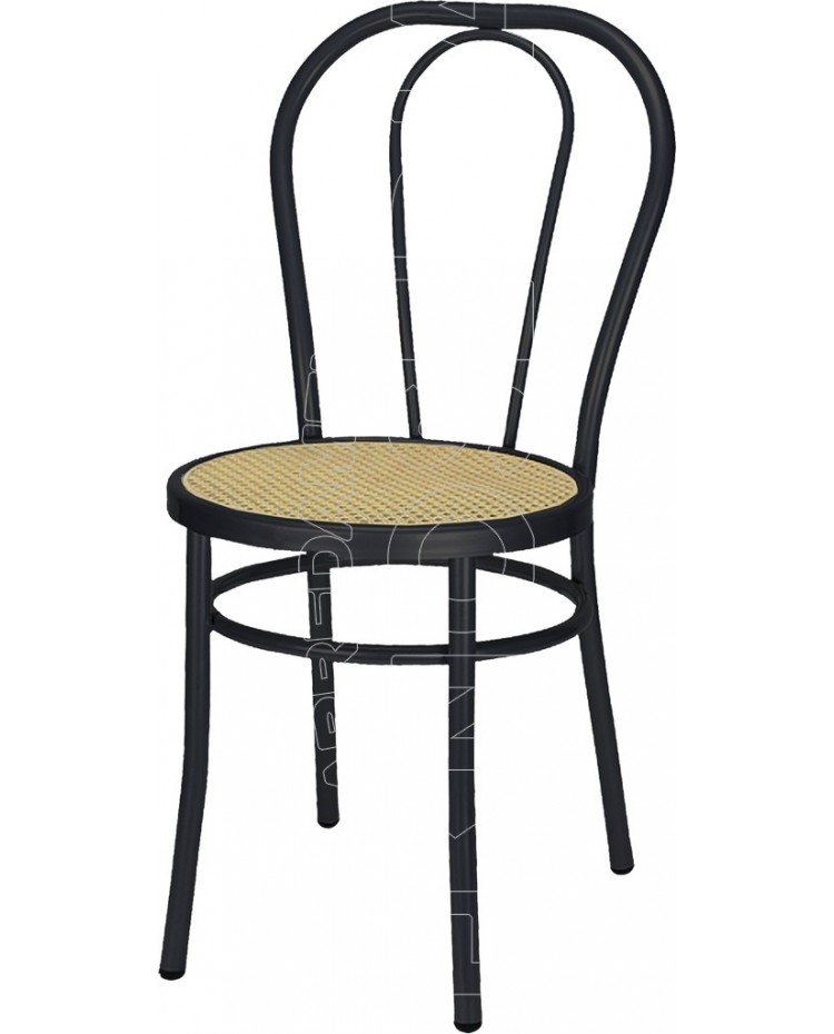 Sedia sovrapponibile con telaio interamente metallico in tubo tondo. Sedile ad incastro in plastica polipropilene motivo fintapaglia.
